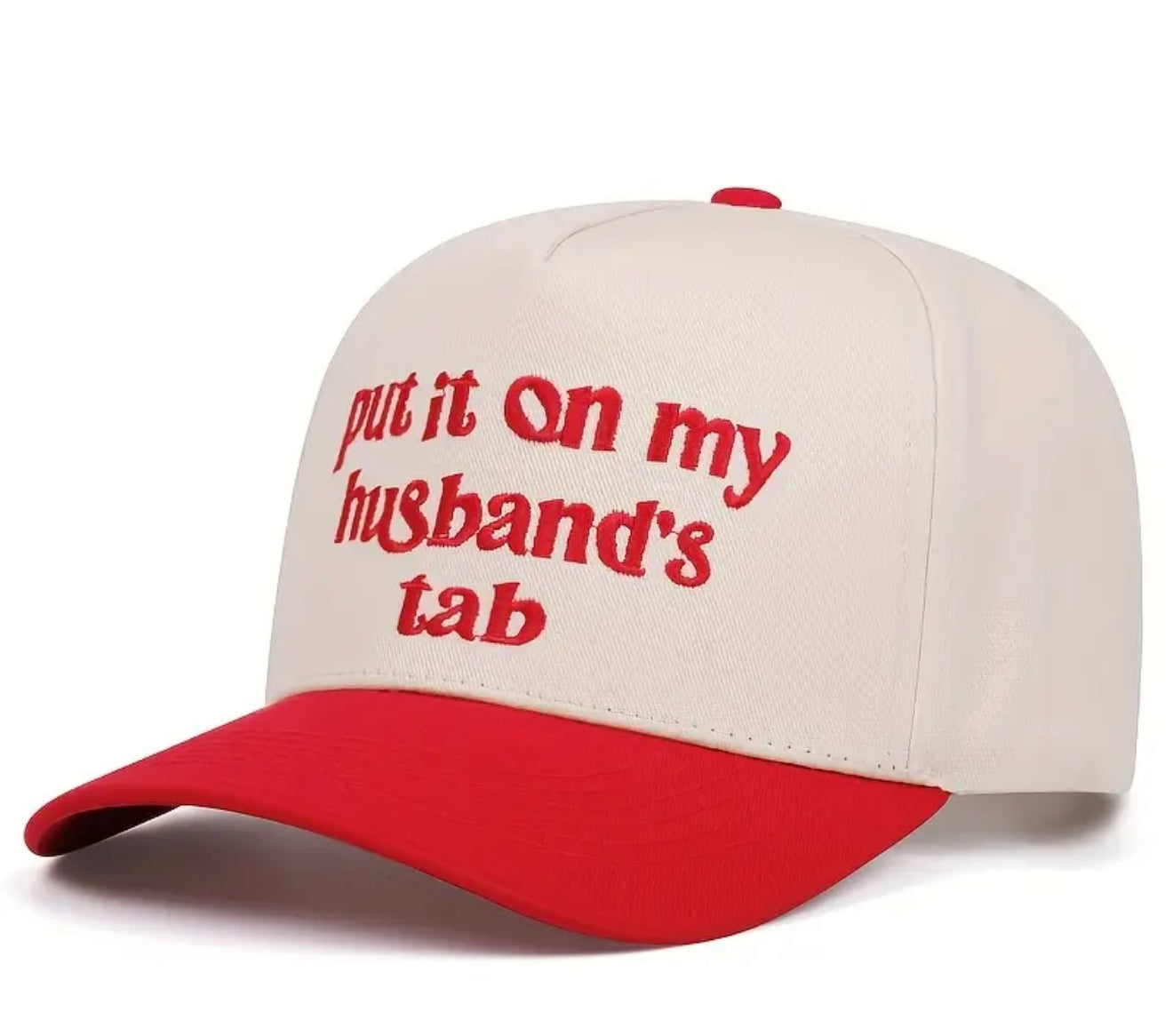 Put It On My Husbands Tab Red & Beige Trucker Hat